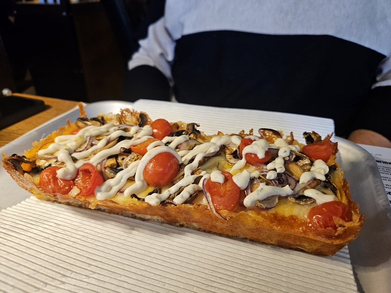 W ramach menu bezmięsnego mieliśmy przyjemność spróbować pizzy z pieczarkami, cebulą, pomidorkami cherry i sosem ziołowym. To danie było dokładnie tym, czego się spodziewaliśmy. Zdecydowanie nie zawiodło oczekiwań - pizza smakiem przypominała nam domową klasykę, jaką jest pizza na grubym spodzie.