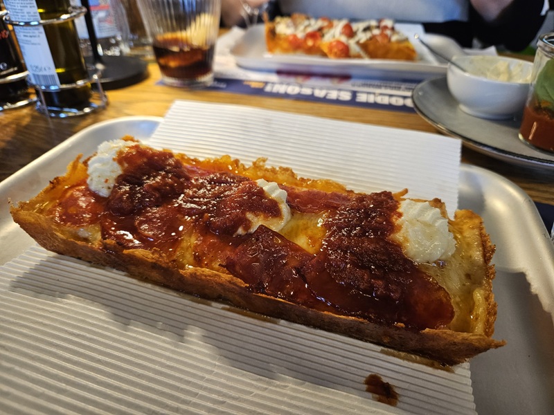 Pizza w stylu Detroit, czyli pizza z blachy, wyróżniała się puszystym ciastem i dobrze wypieczonym spodem. Ostre pepperoni nadawało charakter, a ricotta łagodziła intensywność. Ciekawym dodatkiem był także miód chilli, który przełamywał smak, balansując między subtelną słodyczą a wyraźną pikantnością.