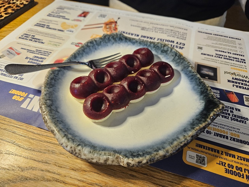 Na zakończenie zjedliśmy sernik na zimno z żelką malinową - deser lekki, a zarazem orzeźwiający, łączył kremowość z delikatną kwasowością. Czego chcieć więcej?