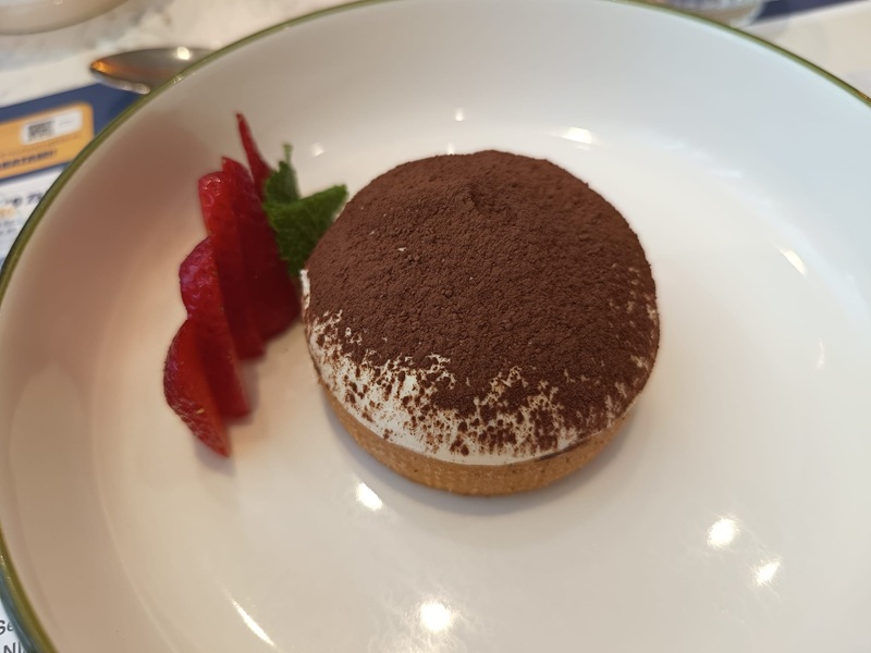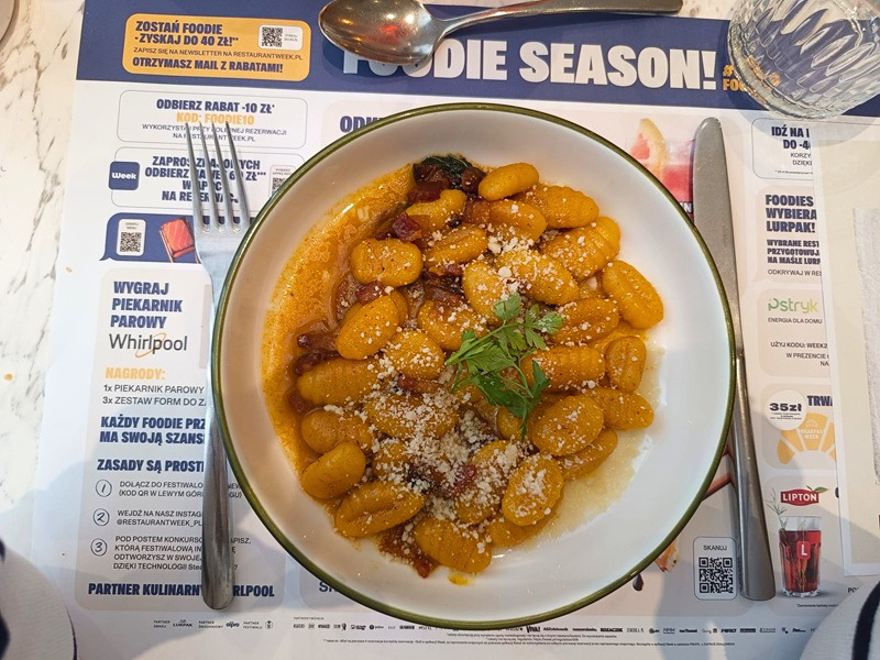 W Menu A przystawka w postaci bruschetty z mortadellą, pistacjami, figami i octem balsamicznym łączyła subtelną słodycz owocu z wytrawnym charakterem wędliny. Danie główne - podsmażane gnocchi z guanciale, masłem szałwiowym, parmezanem i szafranem - było aromatyczne, lecz nienachalne w smaku; jednocześnie mogłoby być nieco bardziej intensywne. Deser, czyli tiramisu z musem czekoladowym, stanowił dopełnienie posiłku.