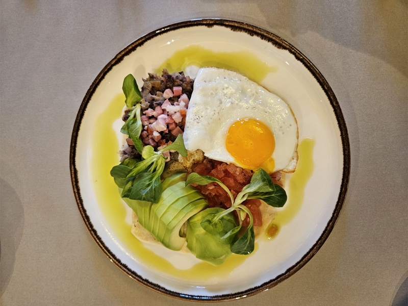 Menu A zachwyciło nas wyrazistością smaków - huevos rancheros były świetnie doprawione, z idealnie przygotowanymi jajkami (kremowe, płynne, ale niezalewające talerza żółtko), aromatyczną czerwoną fasolą i chrupiącym boczkiem. Całość doskonale dopełniało kremowe awokado i chrupiąca tortilla. To właśnie pszenny placek stał się podstawą dania, nadając daniu przyjemną teksturę.