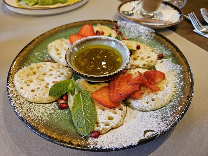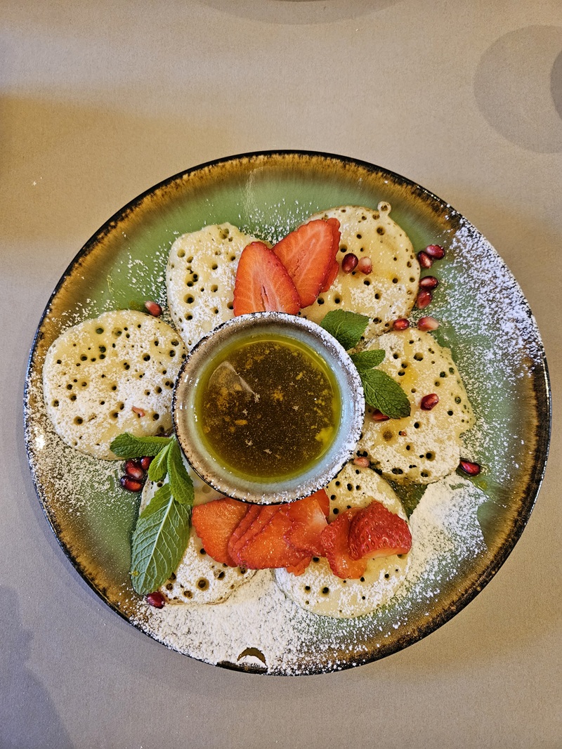 Menu B to z kolei coś dla miłośników śniadań na słodko. Podano baghrir, czyli marokańskie naleśniki z charakterystycznymi dziurkami - stąd ich nazwa "naleśniki tysiąca dziur". Były lekkie i puszyste w środku, a chrupiące z zewnątrz. Miód i świeże owoce, takie jak truskawki i granat dodały kwasowości, tworząc harmonijną kompozycję smaków. Całość została wykończona cukrem pudrem. Lekko, smacznie, przyjemnie!